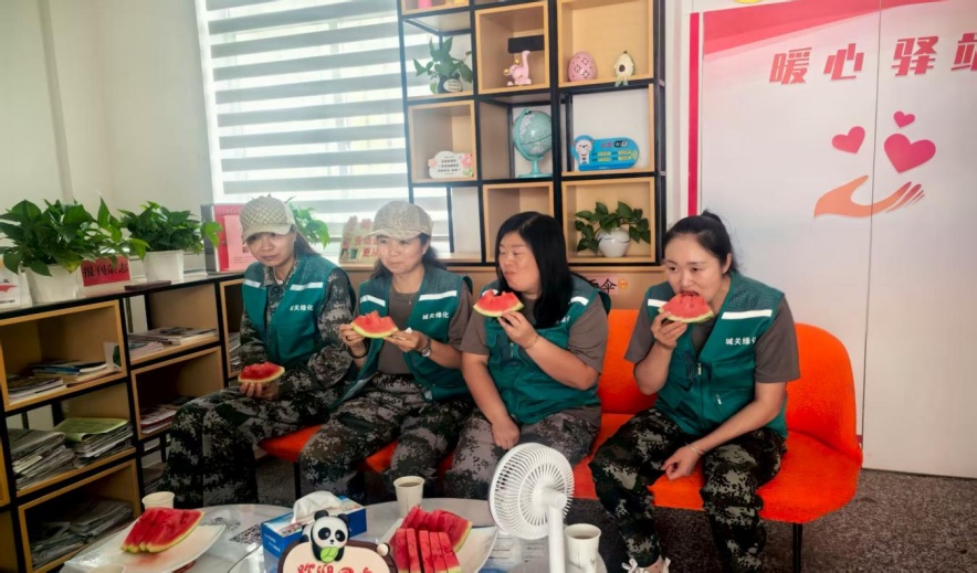 与此同时,在永昌县南龙苑社区工会驿站内,酷暑下劳作的园林绿化工人刚进门,社区工会干部立刻将切好的西瓜递到他们手中……这些细致入微的服务,如春风化雨,成为劳动者触手可及的温暖,让城市文明在更多劳动者心底生根发芽。